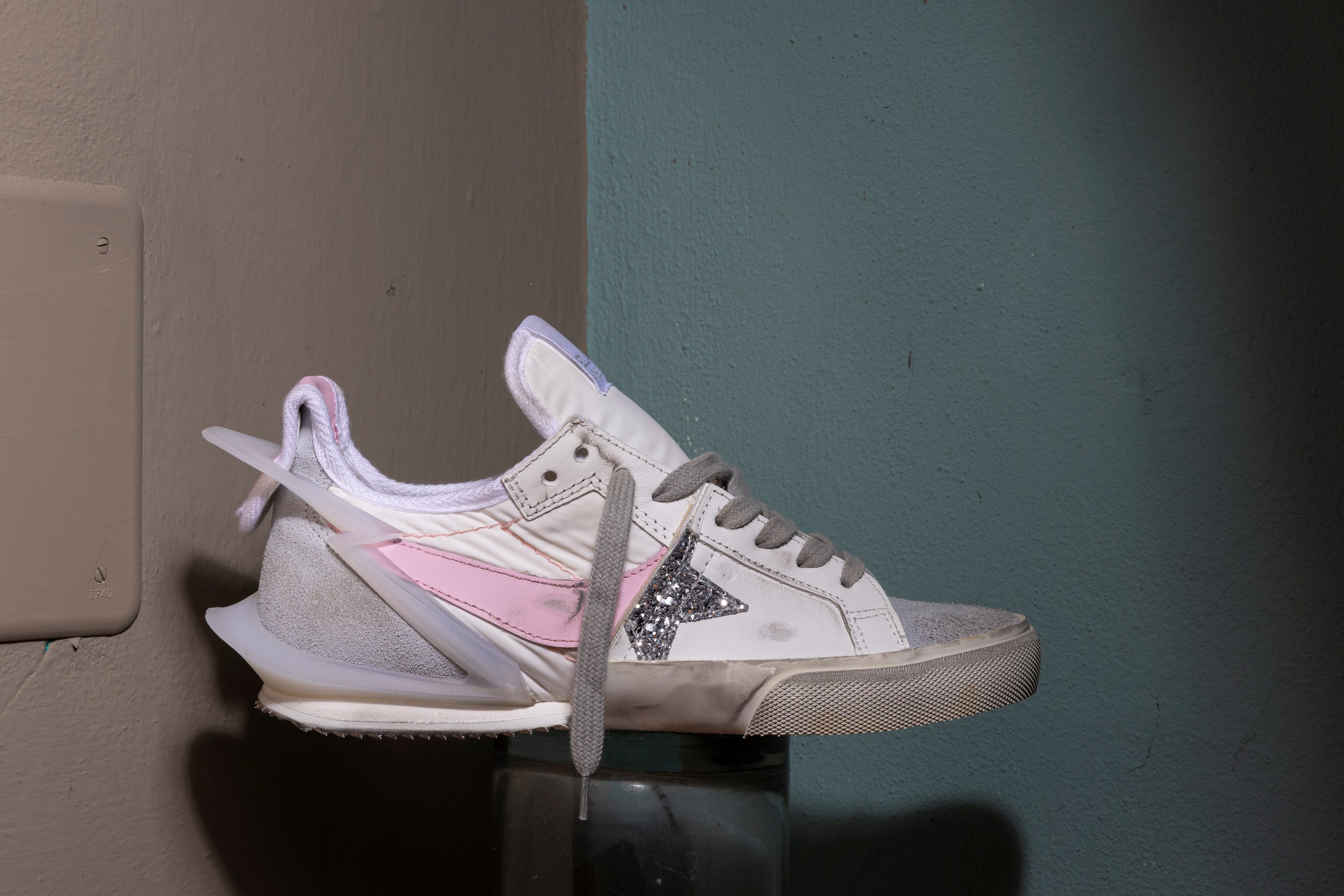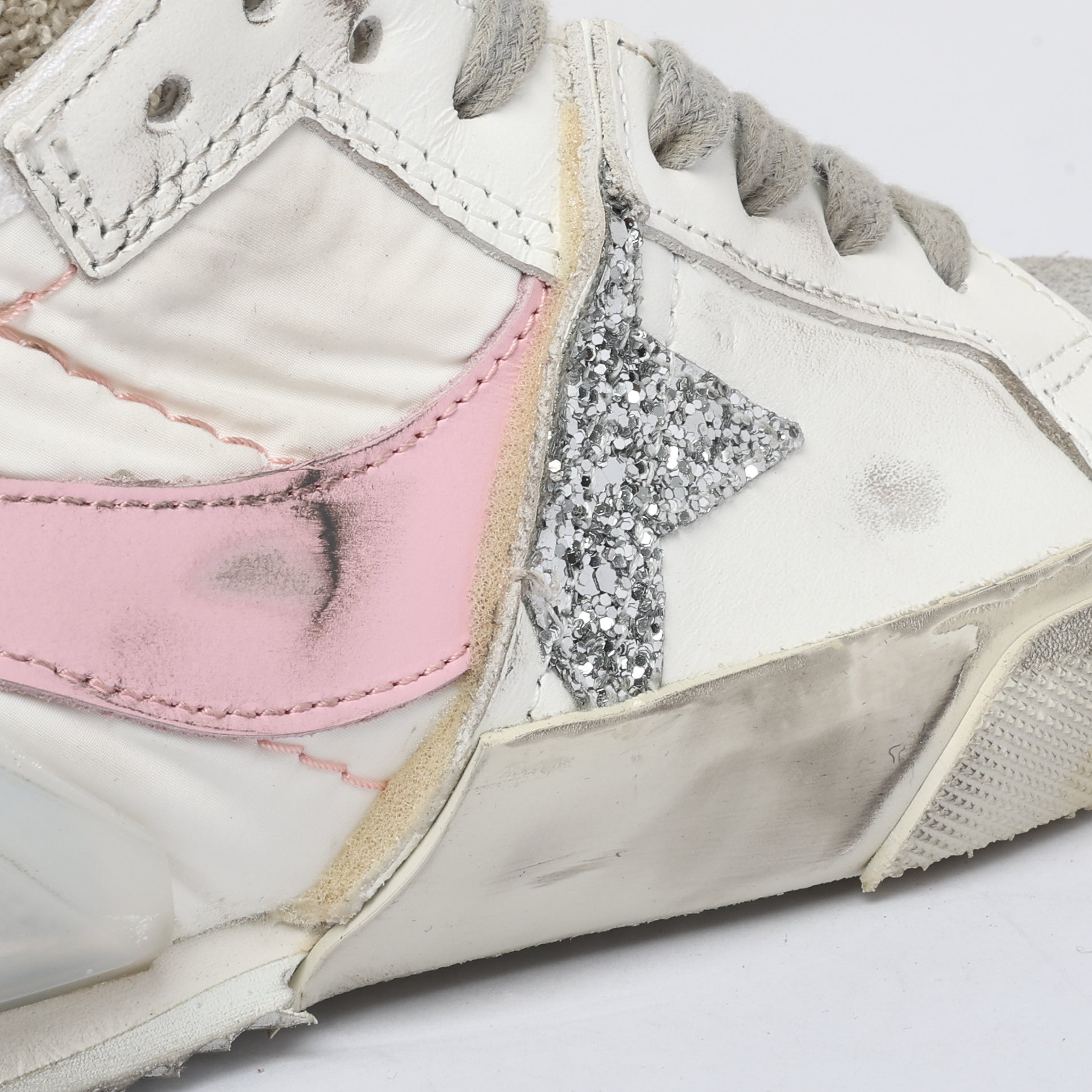Experience unmatched fashion and practicality with LS009WP LIGHTING STAR. This unique shoe boasts a striking blend of the iconic Superstar front design and the bold Daybreak back model. Designed exclusively for women, it features an off-white color with delicate pink details on the stabilizer. Made with premium suede, nylon, and sparkly glitter.